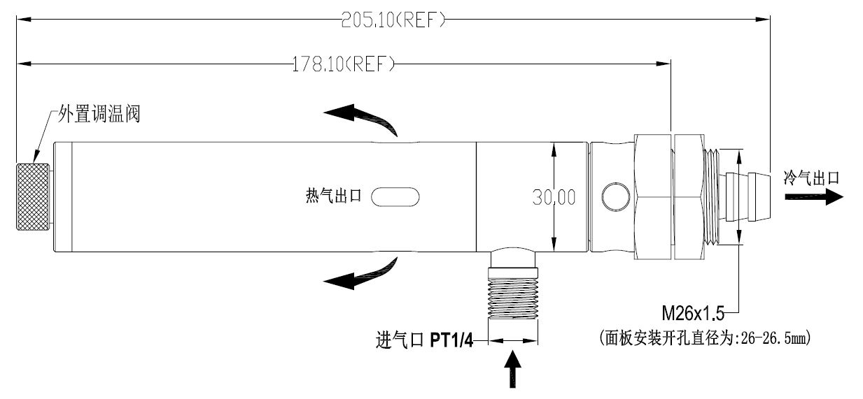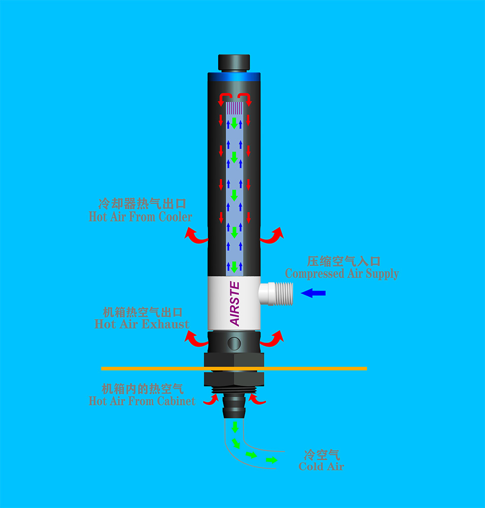 当压缩空气(蓝色箭头)进入机箱冷却器内部涡流管,涡流管将压缩空气转换为冷气流和热气流. 热气流(红色箭头)经过消音器管通过外壳上面的孔排出,冷气流(绿色箭头)进入机箱内制冷. 因连续向机箱内部吹冷风, 机箱内部存在正压. 机箱内部的热空气会通过机箱冷却器内置孔排出到箱体外部.